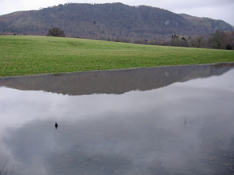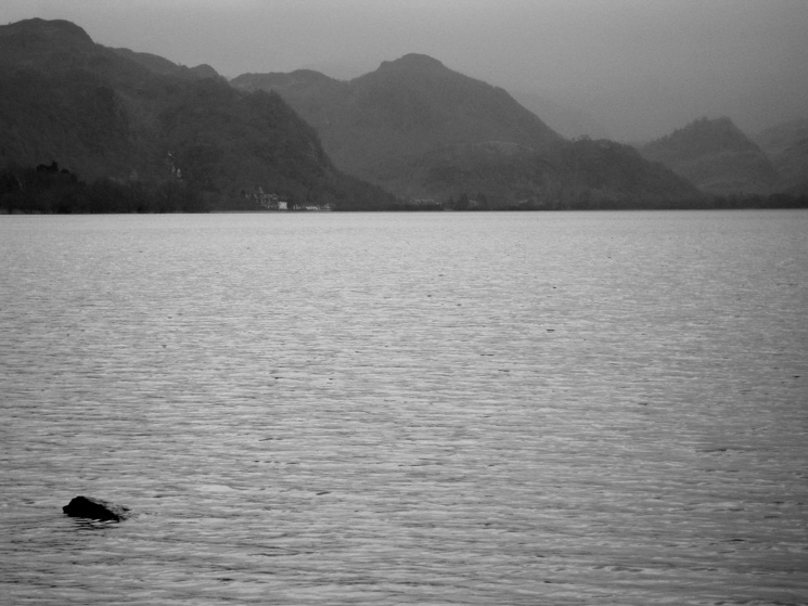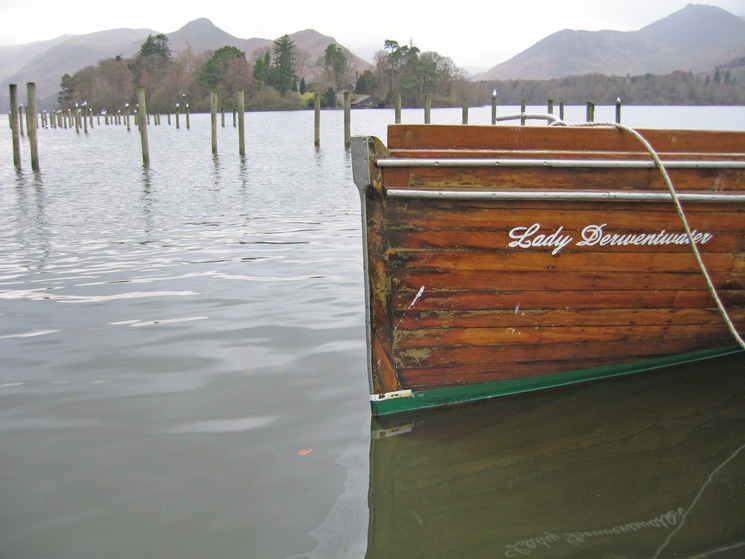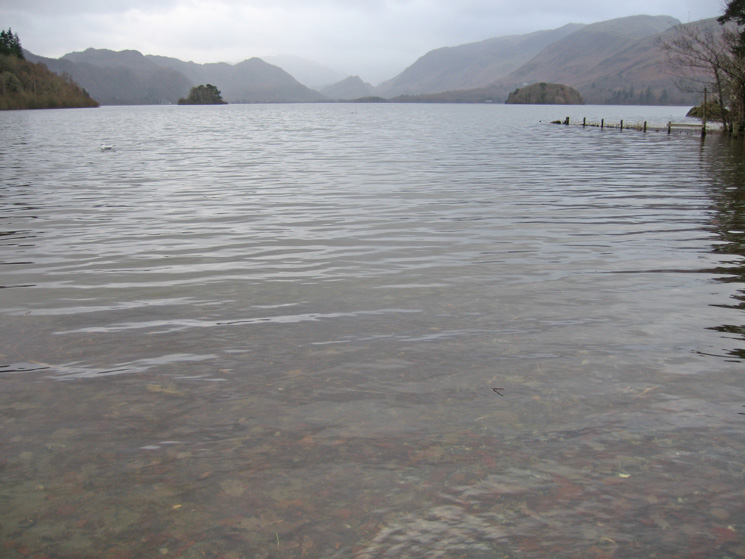 Looking up Derwent Water to Grange Fell and Castle Crag. Only the top of the Hundred Year Stone is out of the water