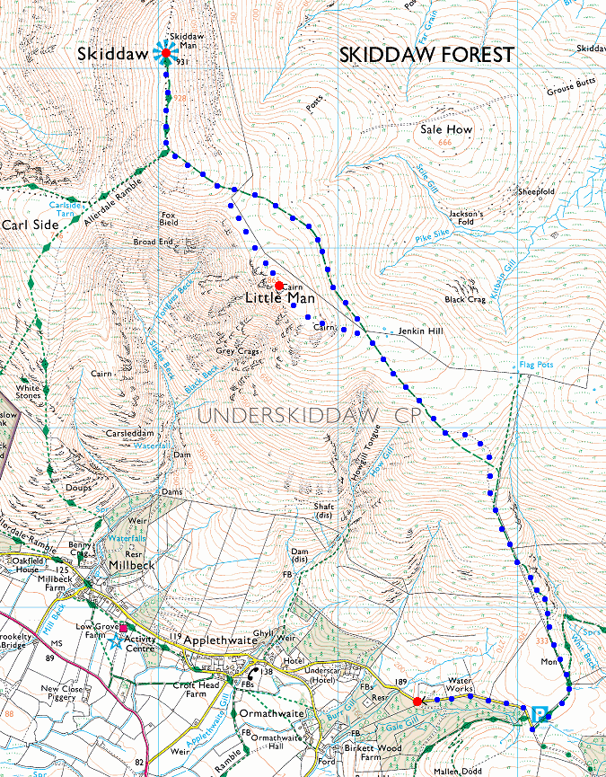 Route: Latrigg car park (end of Gale Road) - Jenkin Hill - Skiddaw Lesser Man - Skiddaw Little Man - Skiddaw - Jenkin Hill - Latrigg car park