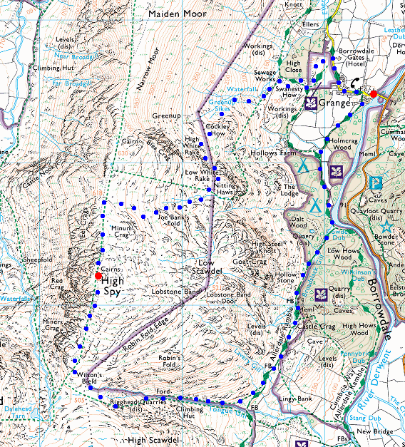 Route: Grange in Borrowdale - Cockley How - Low White Rake - Nitting Haws - High Spy - Rigghead Quarries - Broadslack Gill - River Derwent - Grange in Borrowdale