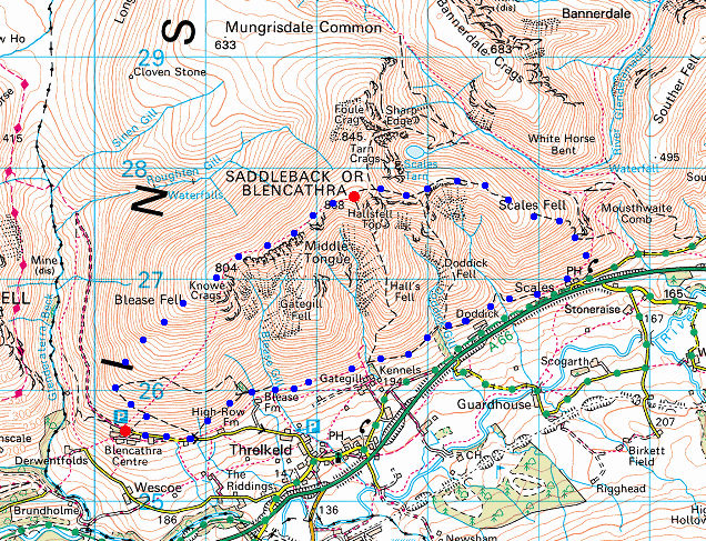 Route: Blencathra Centre, Threlkeld - Blease Fell - Knowe Crags - Gategill Fell Top - Blencathra - Scales Fell - Scales - above Threlkeld on the under Blencathra path - Blencathra Centre