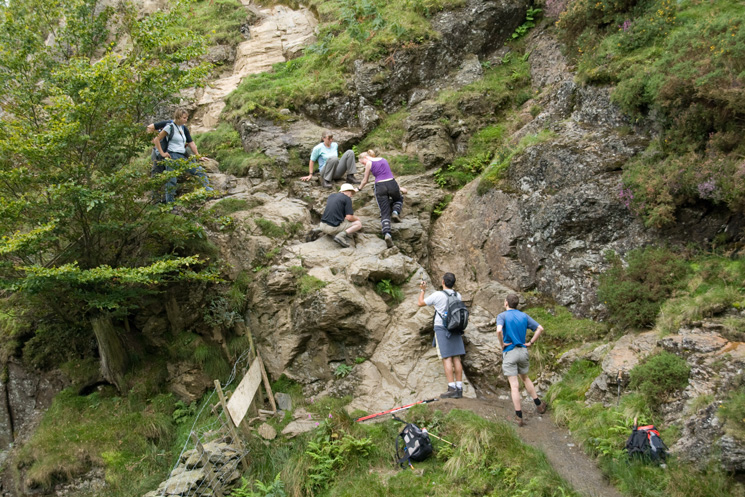 Traffic jam on the short rock step at Scaley Beck on the under Blencathra path