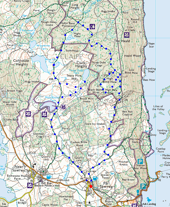 Route: Far Sawrey - Moss Eccles Tarn - Three Dubs Tarn - Wise Een Tarn - Scale Head Tarn - Highs Moss - Claife Heights (High Blind How) - High Pate Crag - Far Sawrey