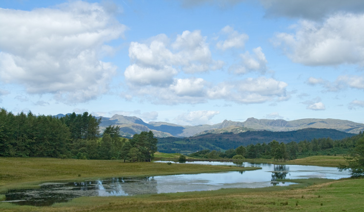 The Langdale Pikes across Wise Een Tarn