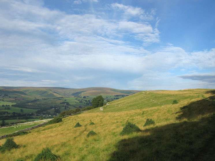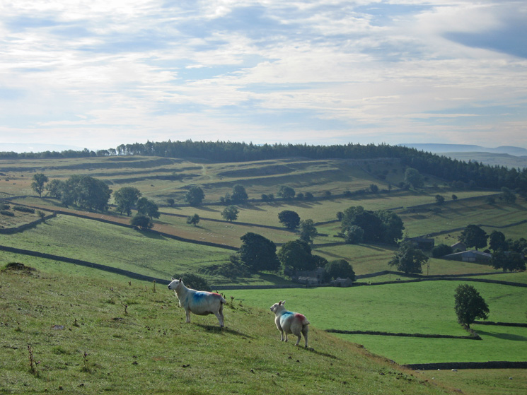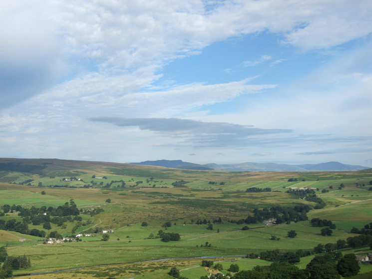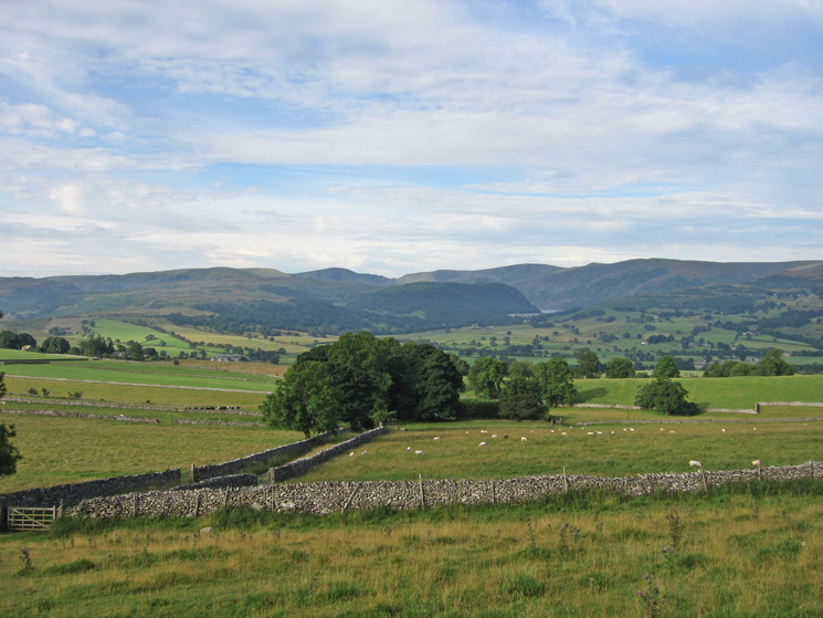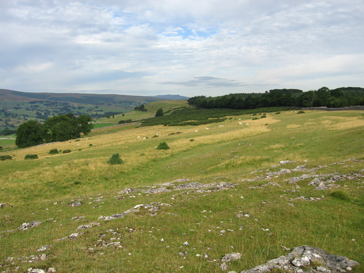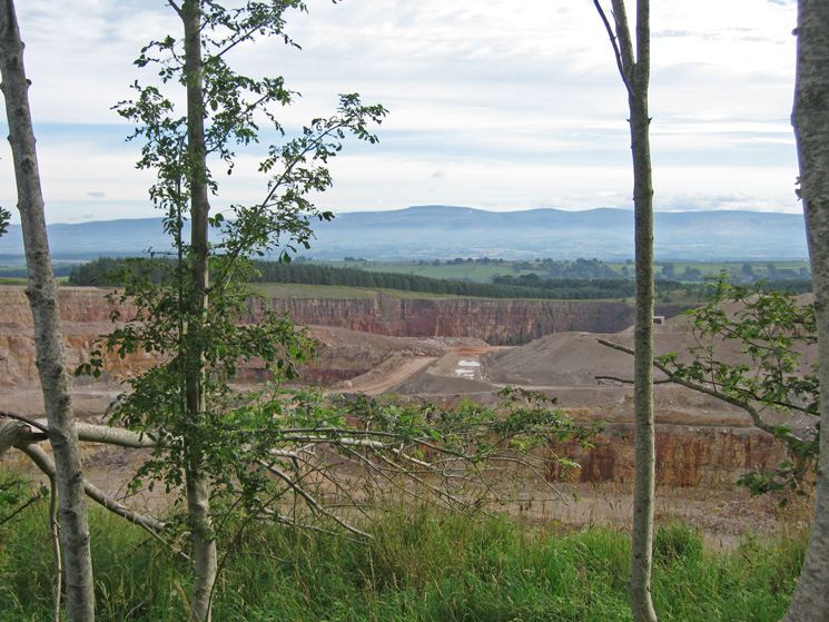 Looking over the wall at the southeast end of Knipescar Common to see Shapbeck Quarry and the North Pennines