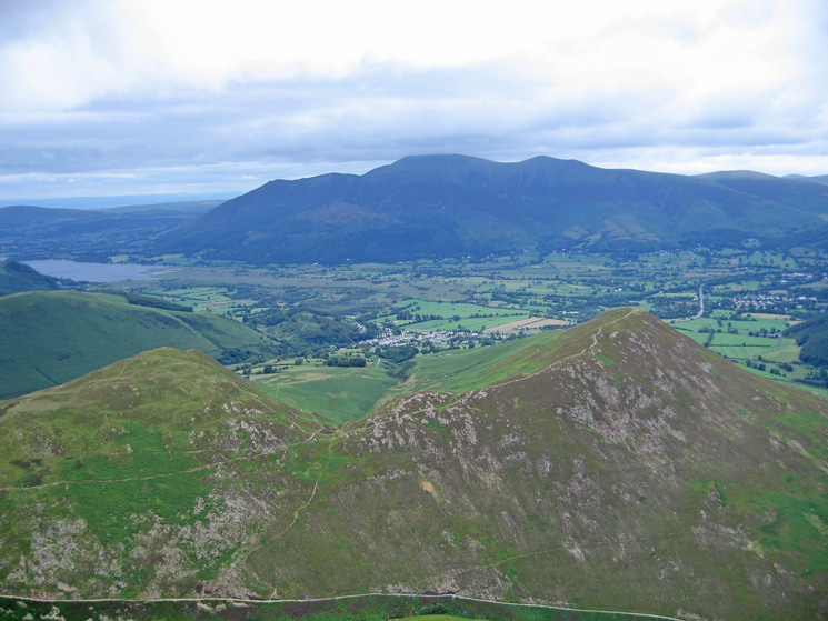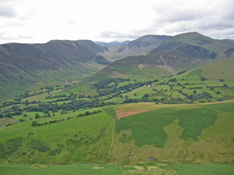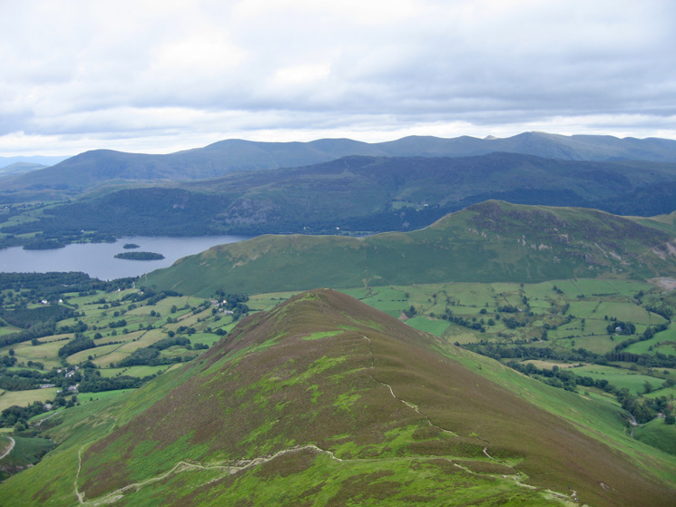 Rowling End below with our ascent path on the left, Catbells, Bleaberry Fell and High Seat and Helvellyn and the Dodds in the far distance