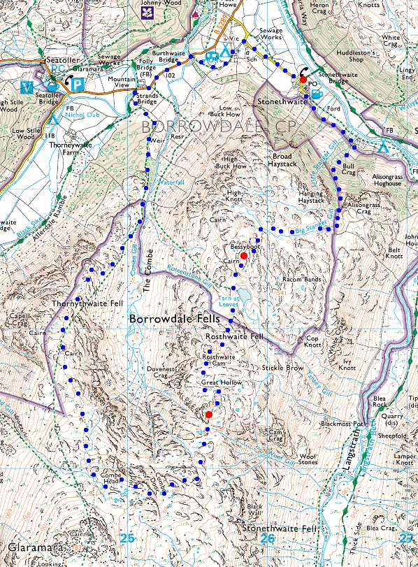 Route: Stonethwaite - Big Stanger Gill - Rosthwaite Fell - Bessyboot top - Tarn at Leaves - Rosthwaite Cam - Rosthwaite Fell - Dovenest Crag top - Combe Door Top - Combe Head - Thornythwaite Fell - Stands Bridge, Seatoller - St Andrew's church, Borrowdale - Stonethwaite