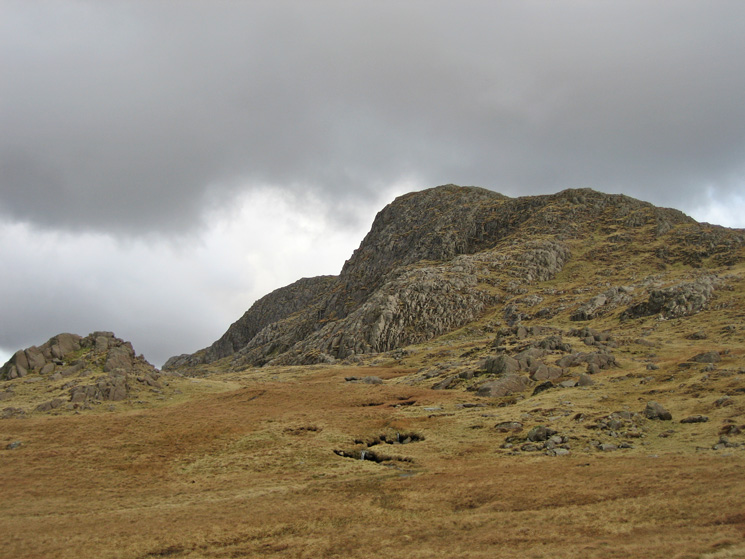 The twin tops of Rosthwaite Fell - Dovenest Crag top (called Stonethwaite Fell by Bill Birkett) with Combe Door Top on the right from Rosthwaite Cam