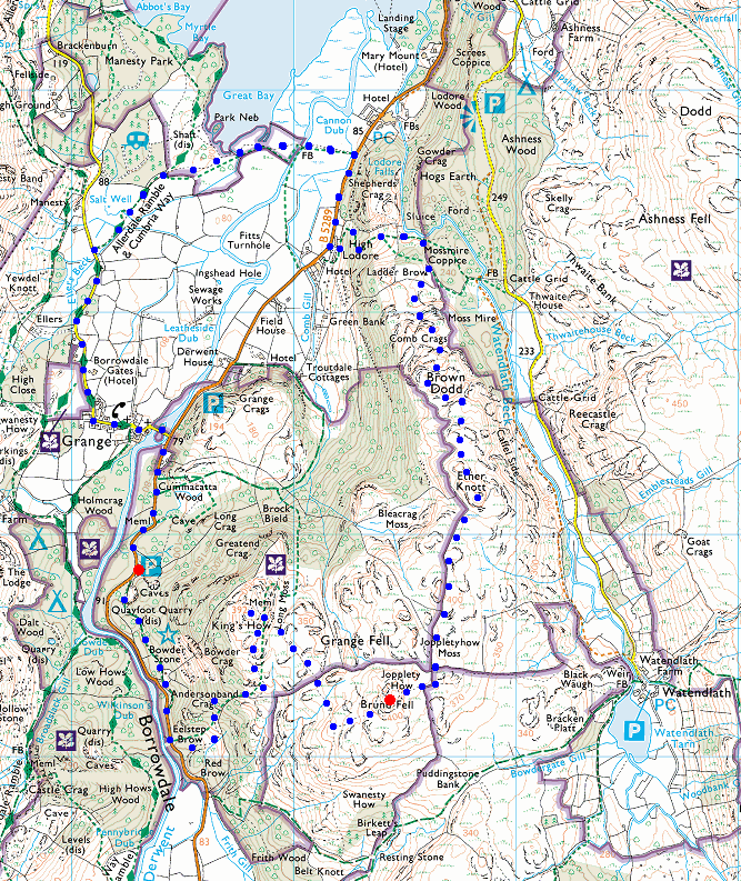 Route: Quayfoot quarry car park - Bowder Stone - Grange Fell (King's How) - Grange Fell (Brund Fell) - Grange Fell (Ether Knott) - Brown Dodd - High Lodore - Cannon Dub - Grange in Borrowdale - Quayfoot quarry car park