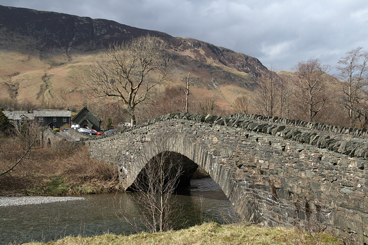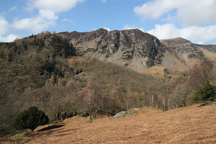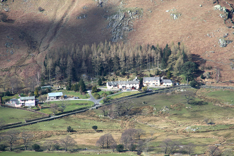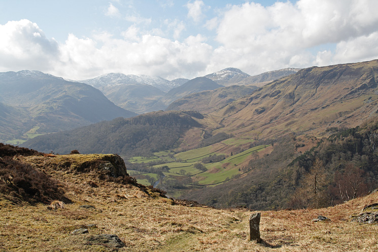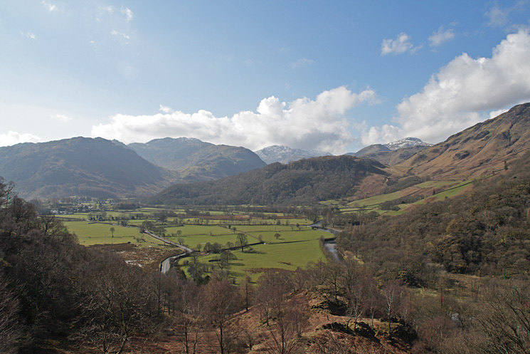 Upper Borrowdale, still some snow of Great End, Scafell Pike and Great Gable