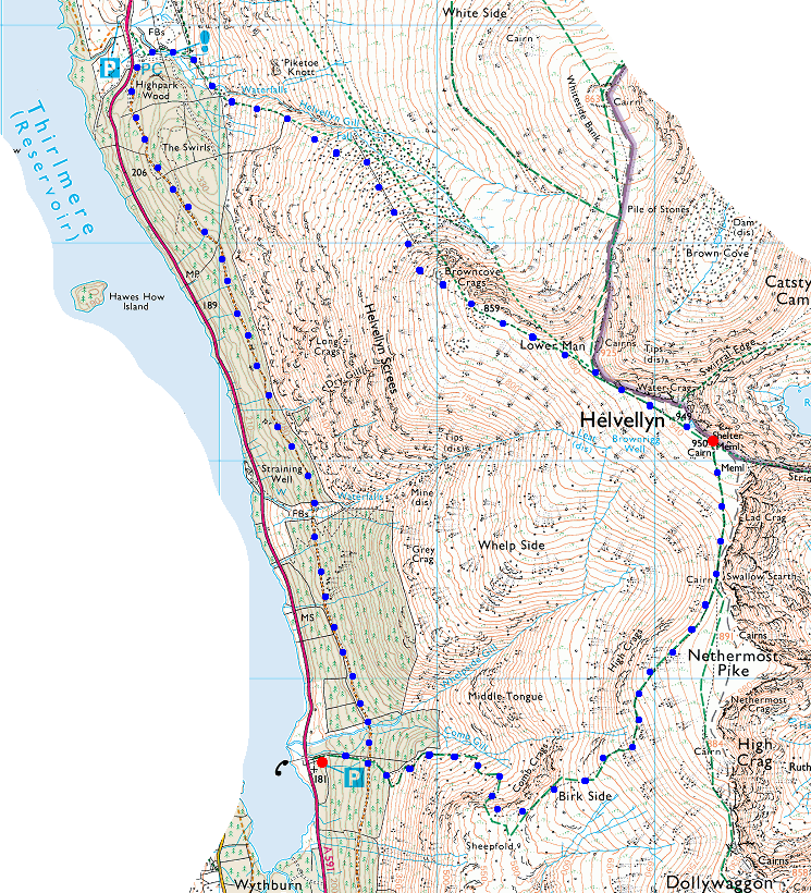 Route: Wythburn - Comb Gill - Birk Side - Swallow Scarth - Helvellyn - Browncove Crags path - Swirls - forest path - Wythburn