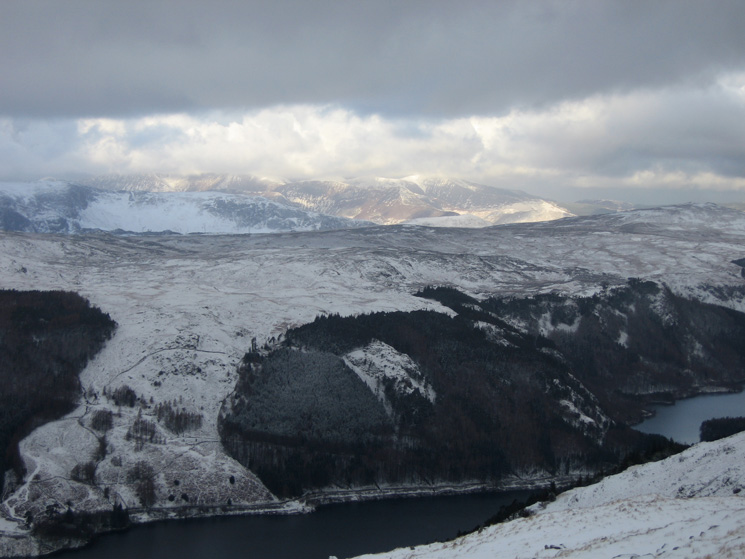 Looking over Thirlmere to the north western fells which are catching some sun