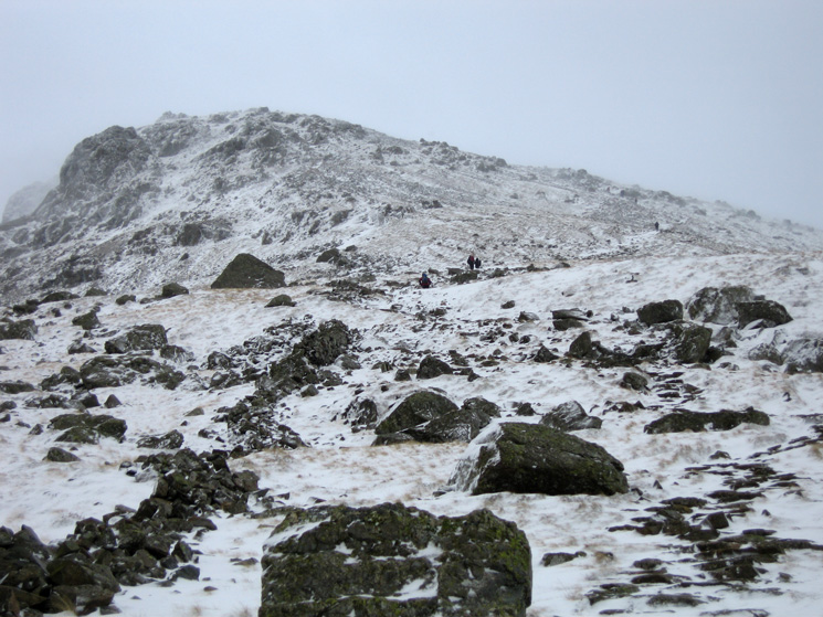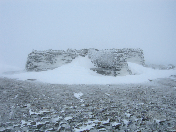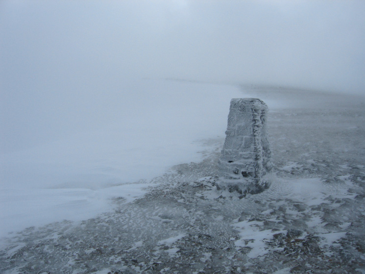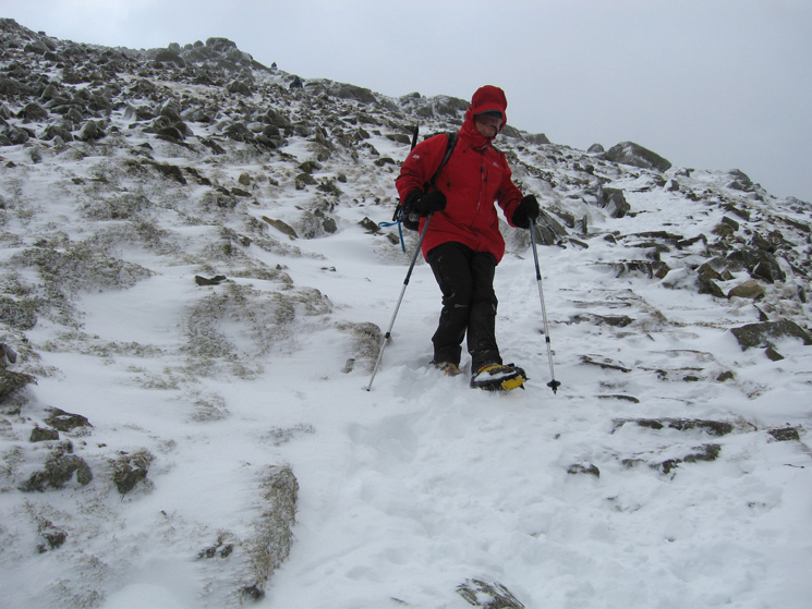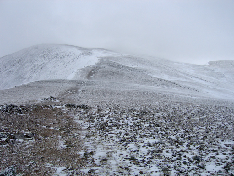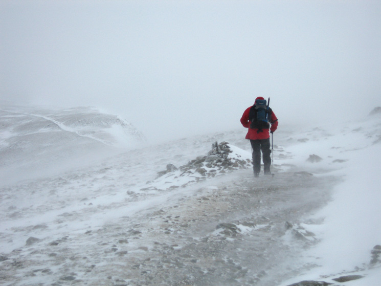 Snow on the ground at all levels. VERY windy on the summit with lots of spindrift and verglas (ice) underfoot. The pitched path down to Swirls was very slippery with the compacted snow.