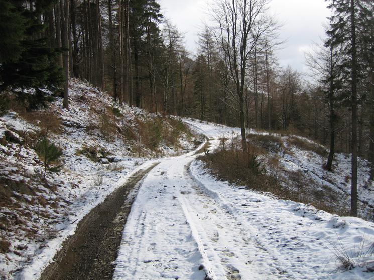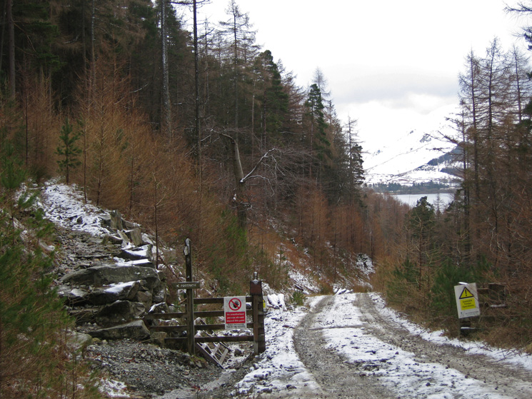The permissive path from Swirls to Wythburn starts off along a forest track