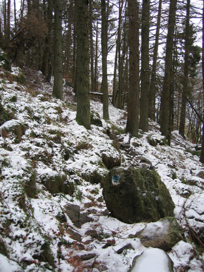An old blue waymarker on the permissive path above Thirlmere