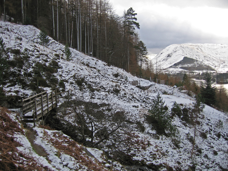 The footbridge over Helvellyn Gill with Raven Crag on the far side of Thirlmere