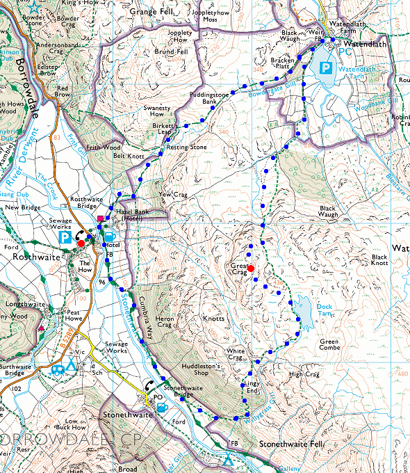 Route: Rosthwaite - Stonethwaite Beck - Lingy End - Dock Tarn - Great Crag - Watendlath Tarn - Watendlath - Puddingstone Bank - Rosthwaite