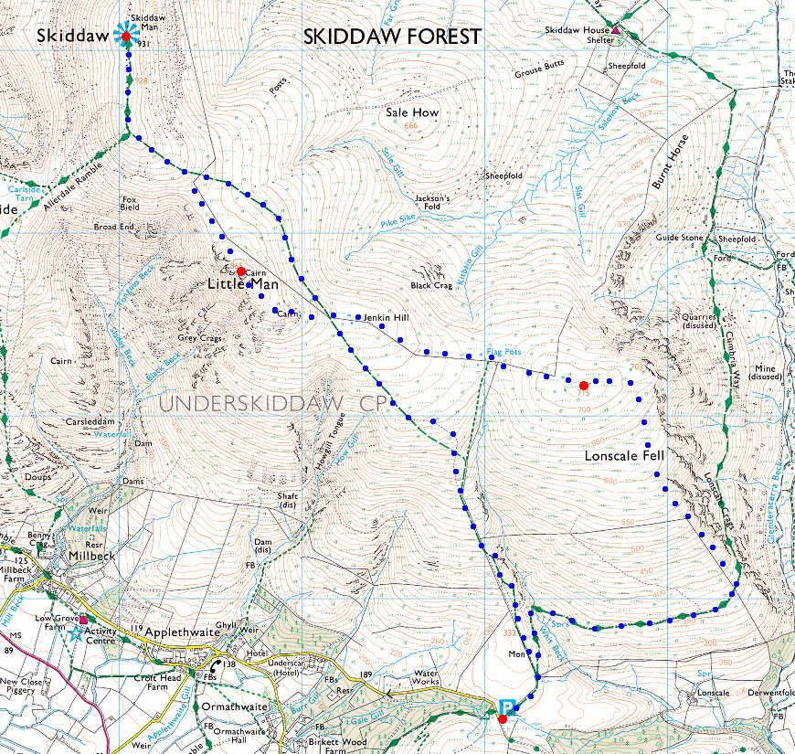 Route: Latrigg car park (end of Gale Road) - Lonscale Fell - Jenkin Hill - Skiddaw Lesser Man - Skiddaw Little Man - Skiddaw - Jenkin Hill - Latrigg car park