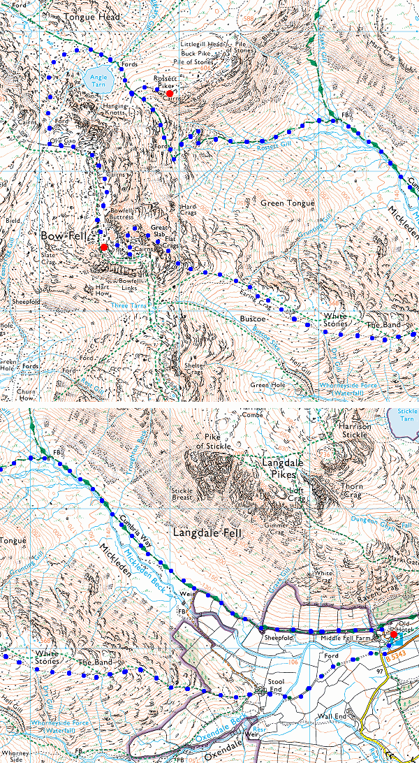 Route: Old Dungeon Ghyll Hotel, Great Langdale - Stool End Farm- The Band - The Climbers' Traverse - Great Slab - Bowfell - Bowfell North Top - Ore Gap - Angle Tarn - Rossett Pike - Rossett Gill - Mickleden - Old Dungeon Ghyll Hotel