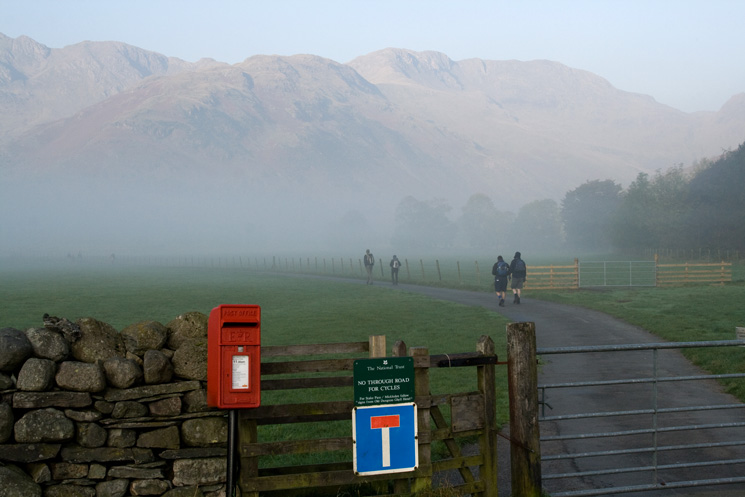 Misty in the valley. The road to Stool End Farm with The Band leading onto Bowfell ahead