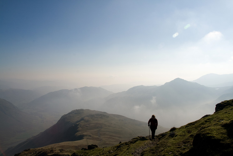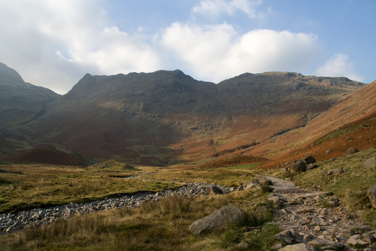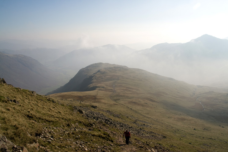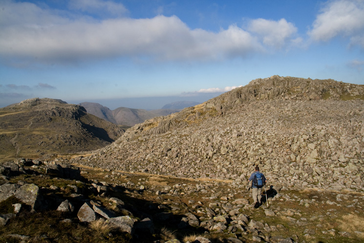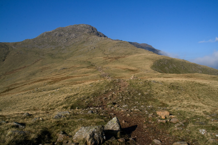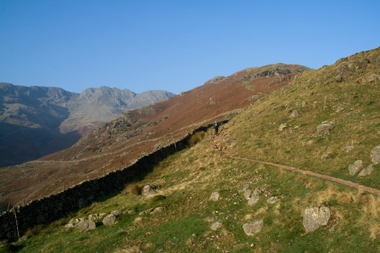 Reaching the start of The climbers' Traverse with the pointed Pike O' Blisco behind