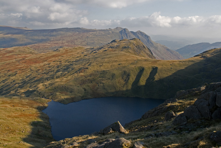 Angle Tarn and Rossett Pike with Langdale Pikes behind from our descent from Ore Gap