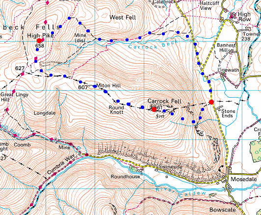 Route: Stone Ends, Mosedale - Further Gill Sike - Carrock Fell - Round Knott - Miton Hill - High Pike - Driggith Mine - Carrock Beck - Carrock Beck Ford - road - Stone Ends