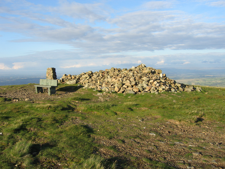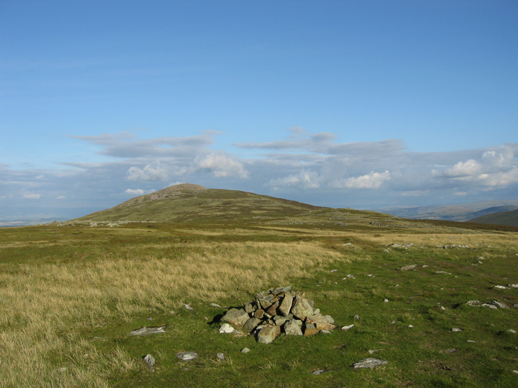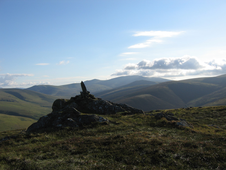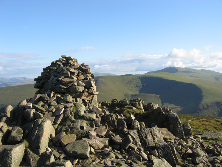 Carrock Fell's summit cairn with Blencathra behind Bowscale Fell