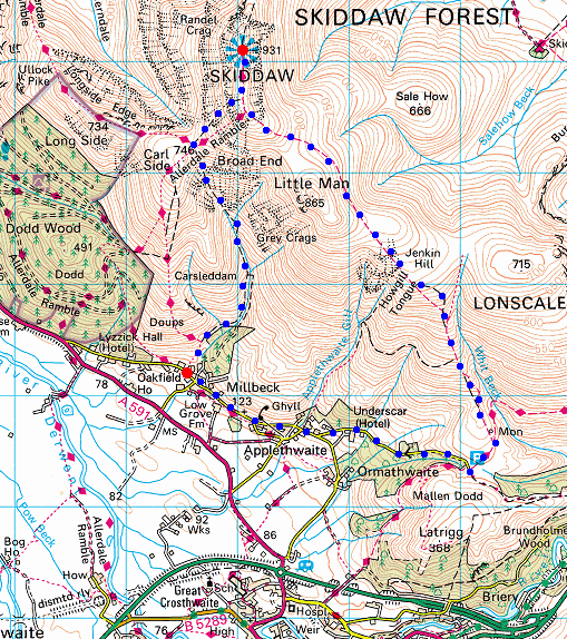 Route: Millbeck - Slades Beck - Carlside Tarn - Skiddaw - Jenkin Hill - Latrigg car park (end of Gale Road) - Applethwaite - Millbeck