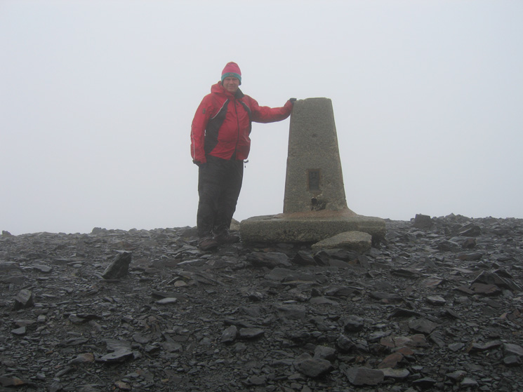Light rain for nearly all the walk, strong wind near and on the summit, cloud base approx 2,200ft.