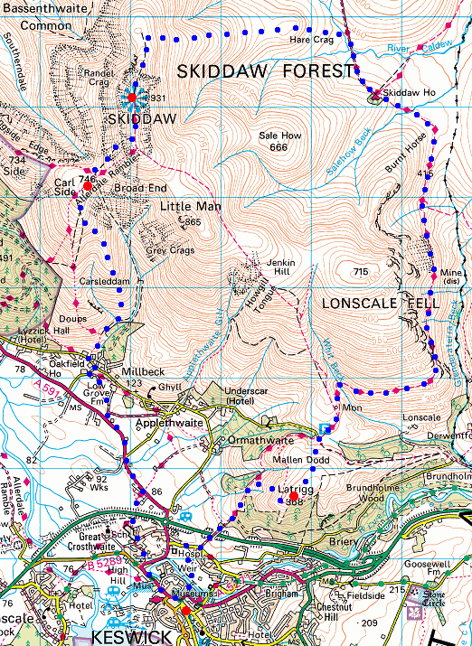 Route: Moot Hall, Keswick - Millbeck - Carsleddam - Carl Side - Carlside Tarn - Skiddaw - north col - Hare Crag - Skiddaw House - Glenderaterra valley - Latrigg car park (end of Gale Road) - Latrigg - Moot Hall