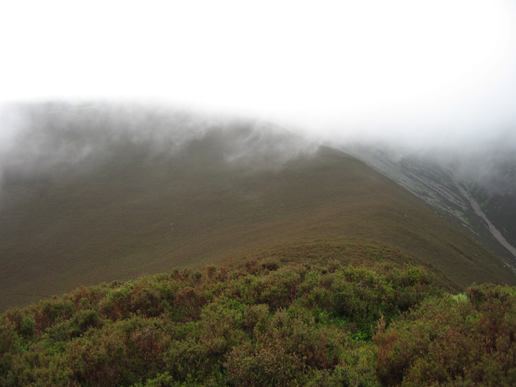 Carl Side in cloud from Carsleddam's summit with the Slades Beck route up to Carlside Tarn and Col on the right