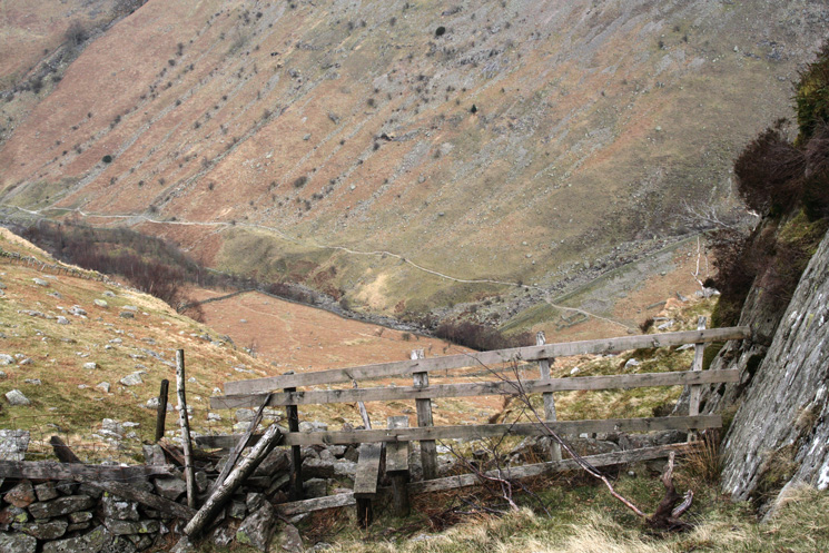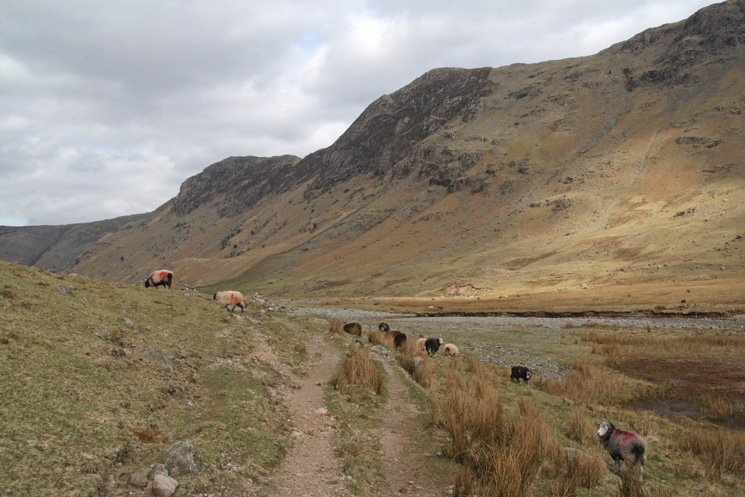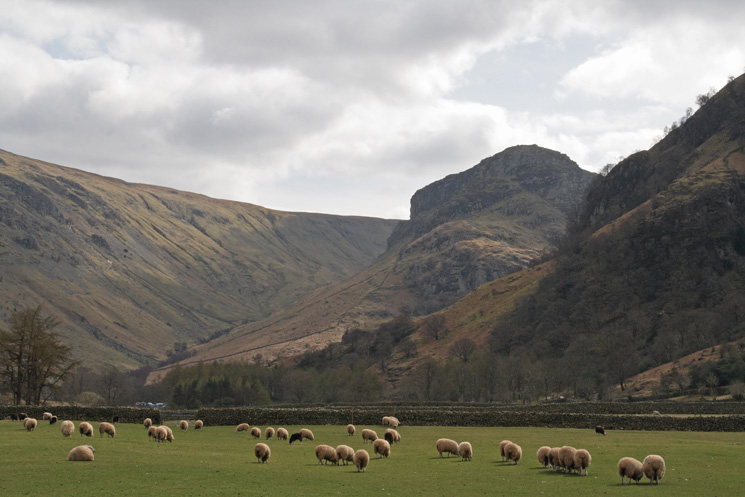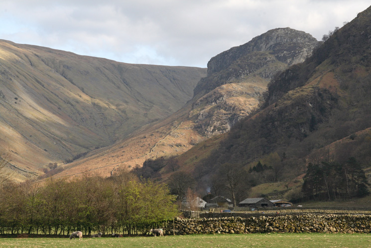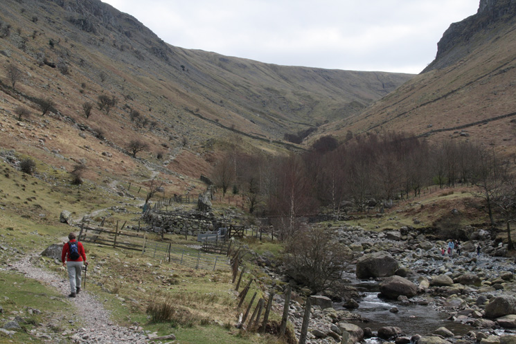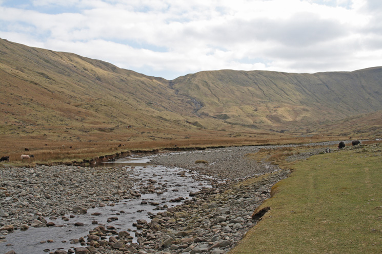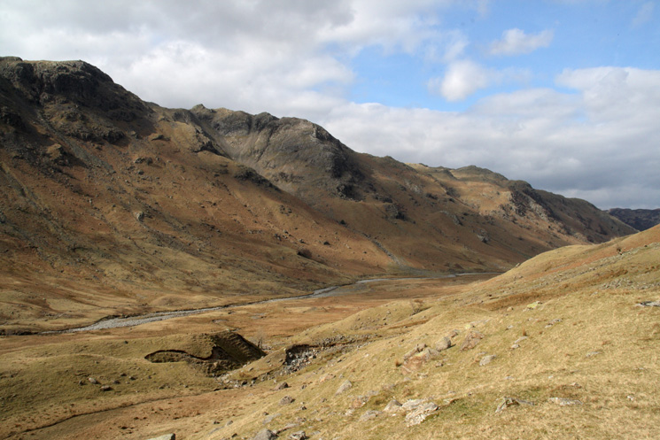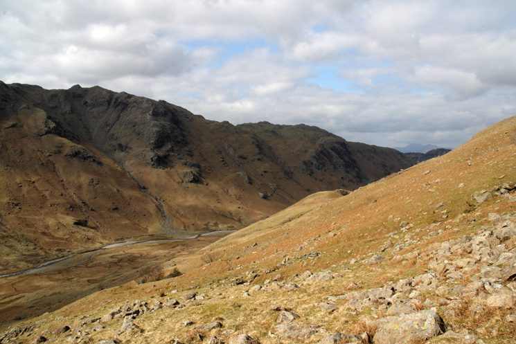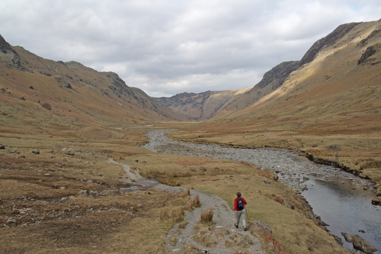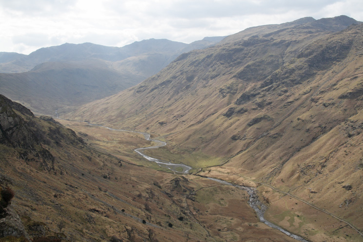 Looking back up Langstrath with Stake Beck descending the far fellside