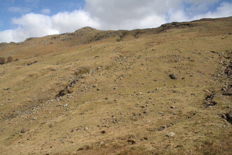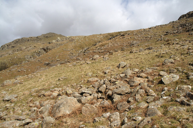 Looking back up our pathless descent route into Langstrath with Brown Crag on the far left