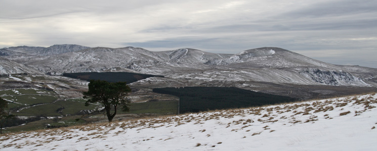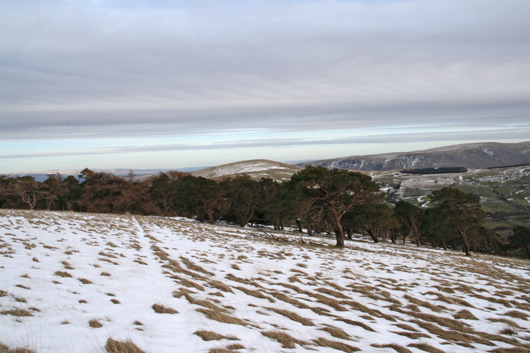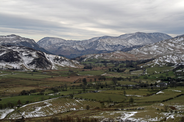 What a difference three days make. Most of the snow has gone and the wind has dropped. A layer of cloud above the fell tops made for dull light.