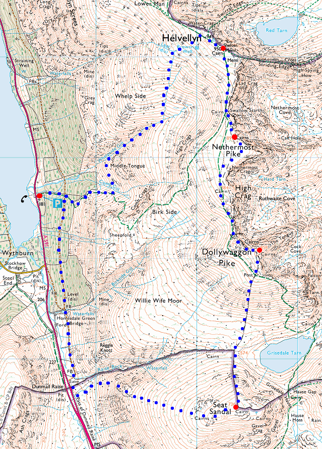 Route: Wythburn - Whelpside Gill - Brownrigg Well - Helvellyn - Swallow Scarth - Nethermost Pike - Dollywaggon Pike - the head of Raise Beck - Seat Sandal - Dunmail Raise - Permissive path - Wythburn