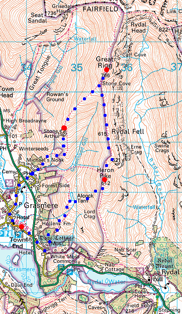 Route: Grasmere Village - Stone Arthur - Great Rigg - Erne Crag top - Heron Pike - Alcock Tarn - Grasmere Village