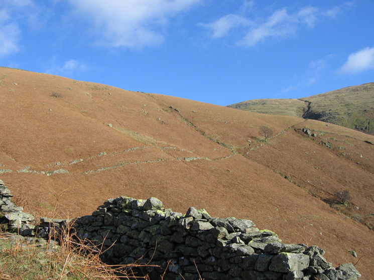 Our route followed a path between the two walls across the fellside before ascending back left to Stone Arthur's summit