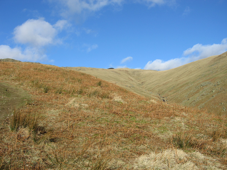 The head of Greenhead Gill, the dark fell on the skyline (middle) is Great Rigg