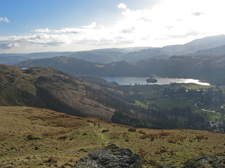Looking back down on Grasmere from Stone Arthur with Alcock Tarn on the far left
