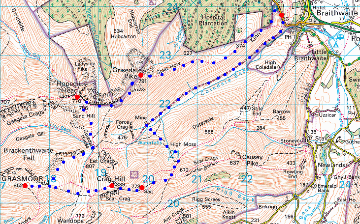 Route: Braithwaite - Kinn - Sleet How - Grisedale Pike - Hopegill Head - Sand Hill - Coledale Hause - Grasmoor - Eel Crag (Crag Hill) - Sail - Sail Pass - Force Crag Mine - Coledale - Braithwaite