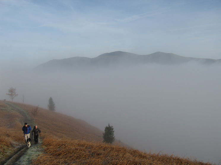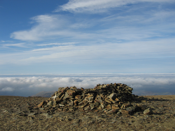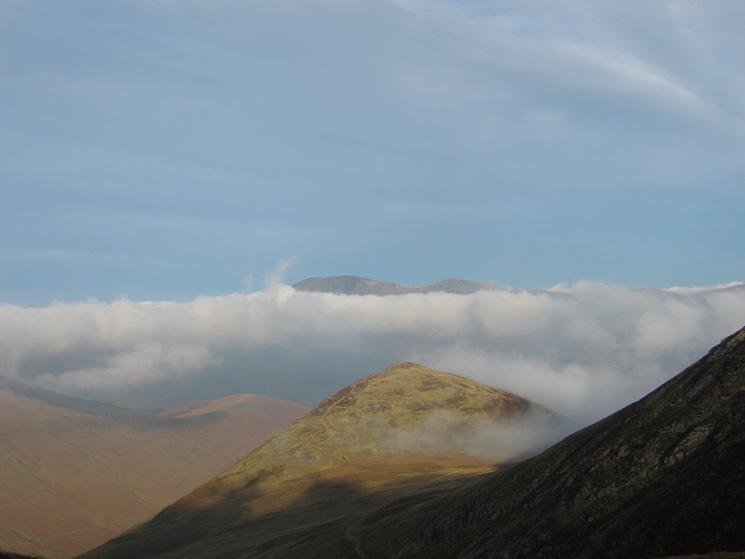 Climbing out of the cloud on to Kinn with Skiddaw behind