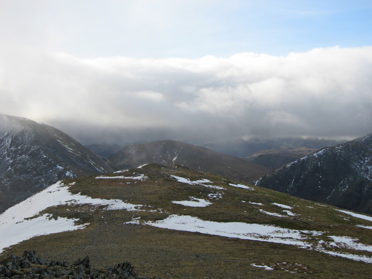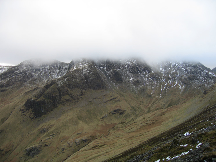 Hart Crag and Fairfield both with their summits in cloud from Gavel Pike