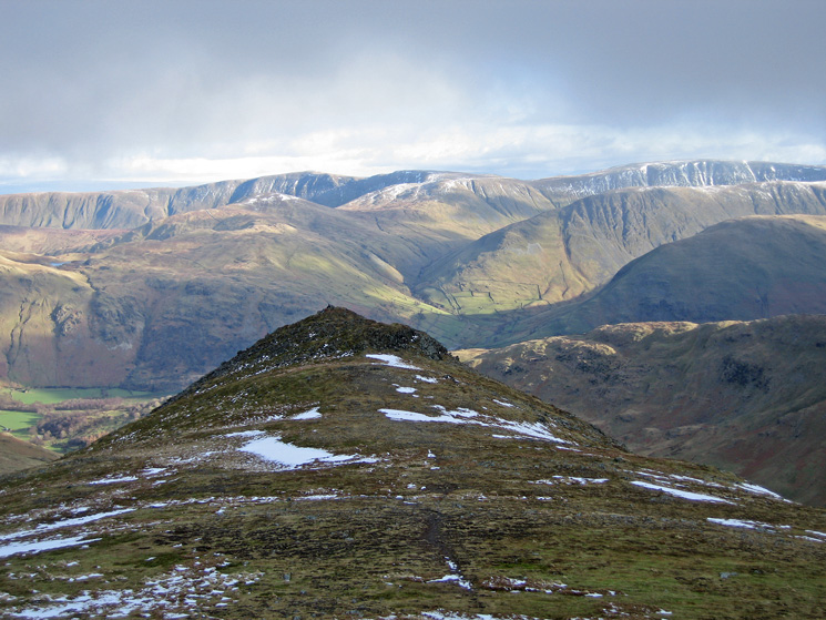 Birks from Arnison Crag's summit with a bit of snow on Saint Sunday Crag behind