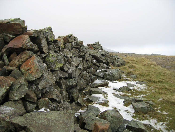 Part of the wall and a very small patch of snow at Dove Crag's summit