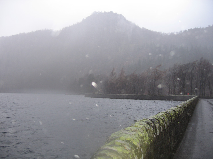 Raven Crag from Thirlmere Dam with the camera flash reflecting off the driving rain