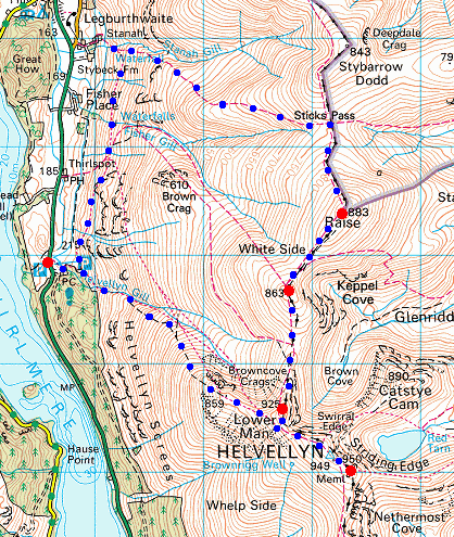 Route: Swirls - Browncove Crags path - Helvellyn - Helvellyn Lower Man - White Side - Raise - Sticks Pass - above Stanah - above Thirlspot - Swirls