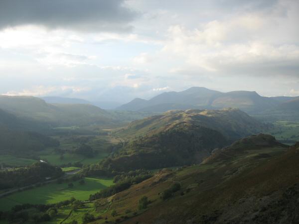 The sun catching the top of High Spying How and Saint Sunday Crag