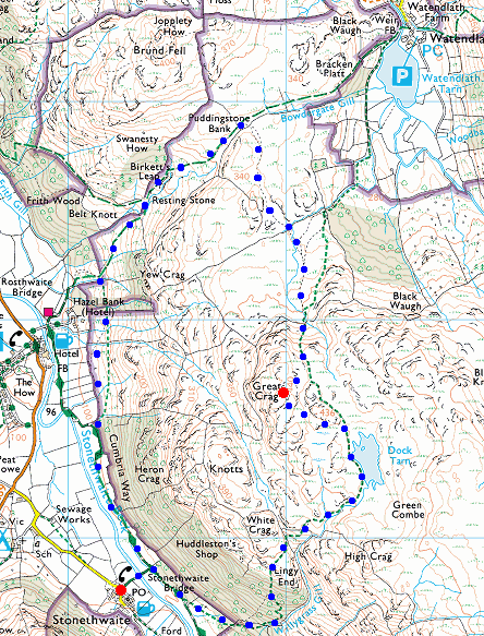 Route: Stonethwaite - Dock Tarn - Great Crag - Puddingstone Bank - above Rosthwaite - Stonethwaite