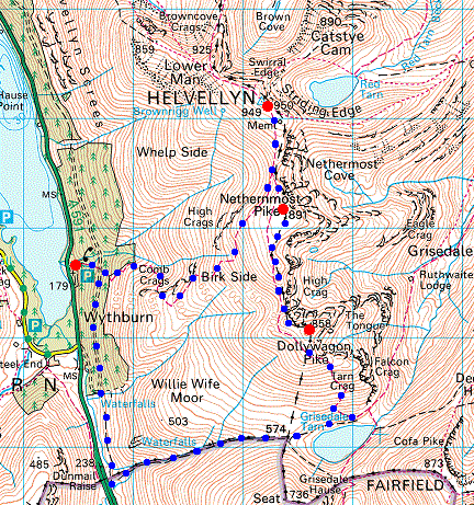 Route: Wythburn - Comb Gill - Birk Side - Swallow Scarth - Helvellyn - Swallow Scarth - Nethermost Pike - High Crag - Dollywaggon Pike - Grisedale Tarn - Raise Beck - Dunmail Raise - Permissive path - Wythburn