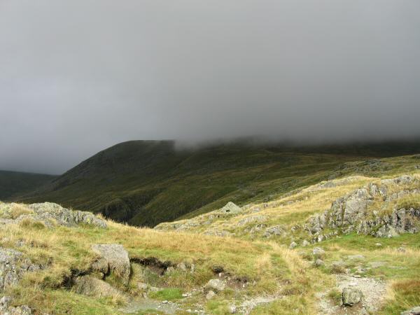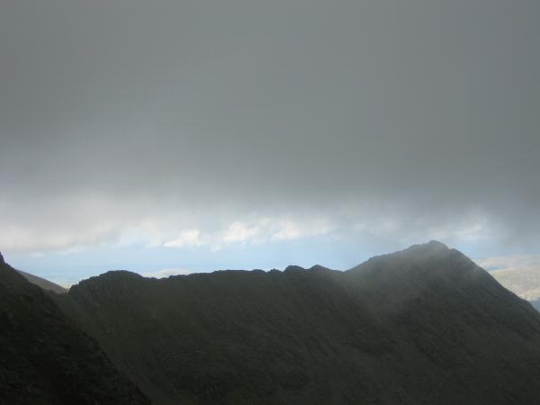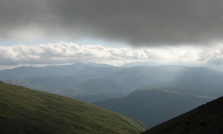 The view west with Bowfell and Scafell Pike clear of the cloud